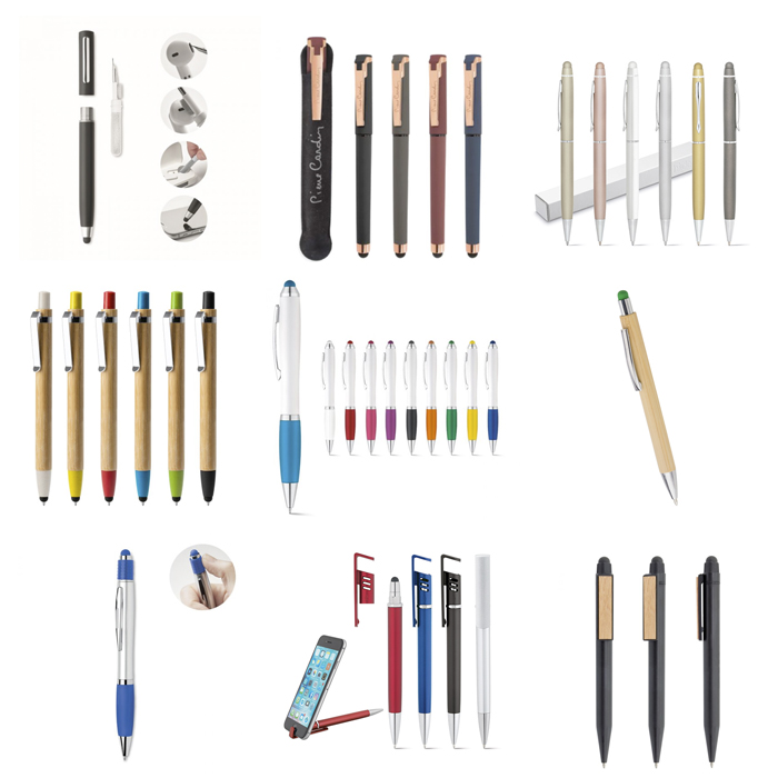 Bolígrafos con punta apta para pantallas táctiles, touch screen, personalizados, muchas opciones en stock y fabricación a medida. Con marcaje de logotipos. Consulta nuestro catálogo, pídenos información: comercial@kairel.com Tel 91 535 33 72 / 649 49 69 91