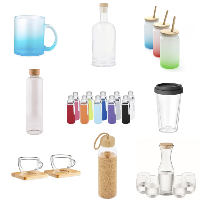 Botellas, tazas y vasos fabricados en cristal personalizados, muchas opciones en stock y fabricación a medida. Con marcaje de logotipos. Consulta nuestro catálogo, pídenos información: comercial@kairel.com Tel 91 535 33 72 / 649 49 69 91