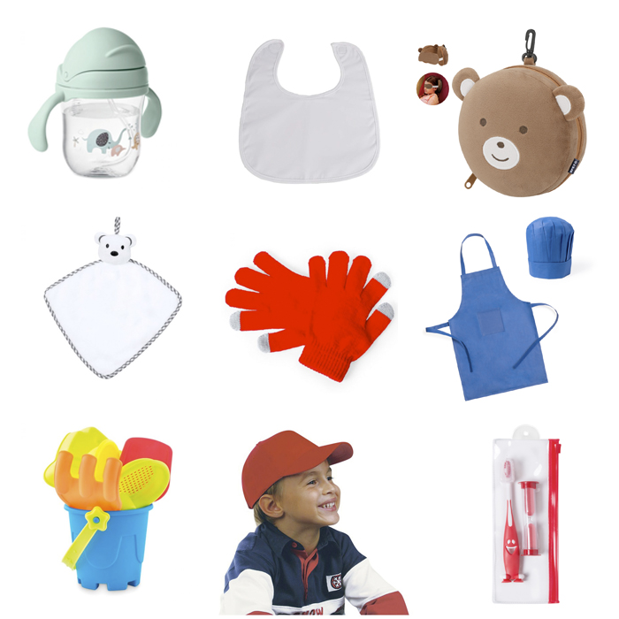 Productos promocionales para niños personalizados, muchas opciones en stock y fabricación a medida. Con marcaje de logotipos. Consulta nuestro catálogo, pídenos información: comercial@kairel.com Tel 91 535 33 72 / 649 49 69 91